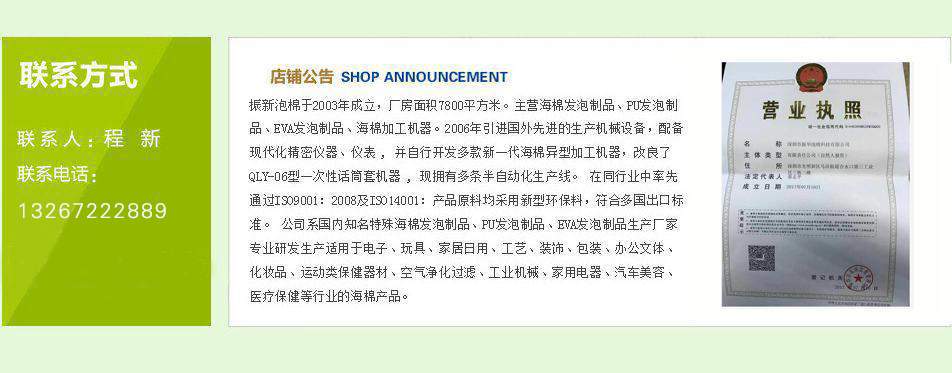 深圳市振新泡棉科技有限公司于2003年成立,廠房面積7800平方米。主營海棉發(fā)泡制品、PU發(fā)泡制品、EVA發(fā)泡制品、海棉加工機器。2006年引進國外先進的生產(chǎn)機械設備,配備現(xiàn)代化精密儀器、儀表 , 并自行開發(fā)多款新一代海棉異型加工機器,改良了QLY-06型一次性話筒套機器 , 現(xiàn)擁有多條半自動化生產(chǎn)線。 我們擁有一批經(jīng)驗豐富的工程技術人員和高級管理人員,在同行業(yè)中率先通過ISO9001:2008及ISO14001:產(chǎn)品原料均采用新型環(huán)保料,符合多國出口標準。 公司系國內(nèi)知名特殊海棉發(fā)泡制品、PU發(fā)泡制品、EVA發(fā)泡制品生產(chǎn)廠家,專業(yè)研發(fā)生產(chǎn)適用于電子、玩具、家居日用、工藝、裝飾、包裝、辦公文體、化妝品、運動類保健器材、空氣凈化過濾、工業(yè)機械、家用電器、汽車美容、醫(yī)療保健等行業(yè)的海棉產(chǎn)品。 產(chǎn)品的類型如:高密度聚酯海棉、普通海棉、異型定型海棉、防火/阻燃海棉、高回彈/慢回彈海棉、過濾網(wǎng)狀海棉、EVA玩具禮品、PU發(fā)泡定型玩具禮品等等。產(chǎn)品名稱如:耳機/話筒KTV海棉套、海棉圓球、洗刷海棉、吸水海棉、木漿海棉、化妝海棉、相機海棉、墨盒海棉、壓縮海棉、橡膠海棉、粗細孔過濾海棉、波峰隔音海棉、醫(yī)用海棉、海棉枕頭、包裝防震海棉、1mm厚海棉、電子/醫(yī)用海棉棉簽、EVA球、EVA智力拼圖、EVA鑰匙扣、PU座墊、PU公仔、PU球類等等。 我們還獲得多家國際知名廠商的授權(quán)資格,代理多品種家庭用品。 產(chǎn)品多年來一直銷往全球,深受廣大用戶和客商的青睞。